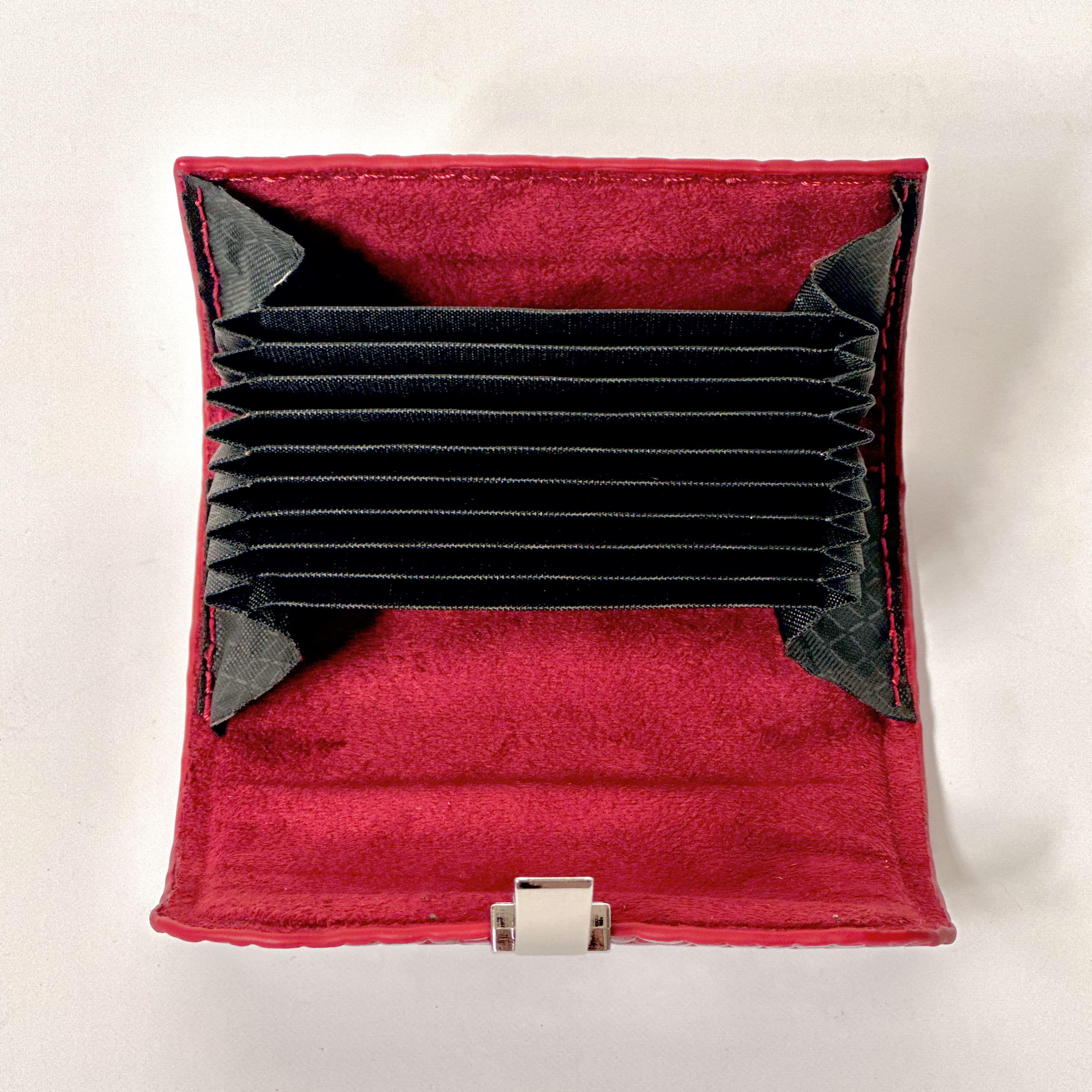 چرم ورنی زرشکی جلوهای لوکس و خاص به محصول داده و آن را به یک اکسسوری چشمگیر در کیف یا دست شما تبدیل میکند. همچنین وجود قفل نیکل محکم باعث میشود کارتها در نهایت امنیت نگهداری شوند و از افتادن یا خم شدن آنها جلوگیری شود.