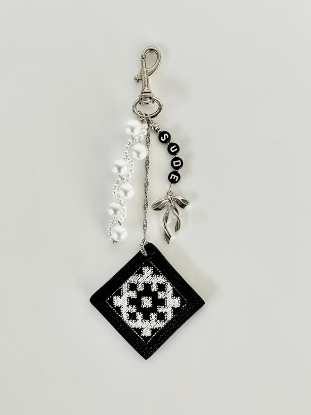 جاکلیدی چرم طبیعی سوزندوزی بلوچی، مروارید و آویز اسم شخصی سازی شده