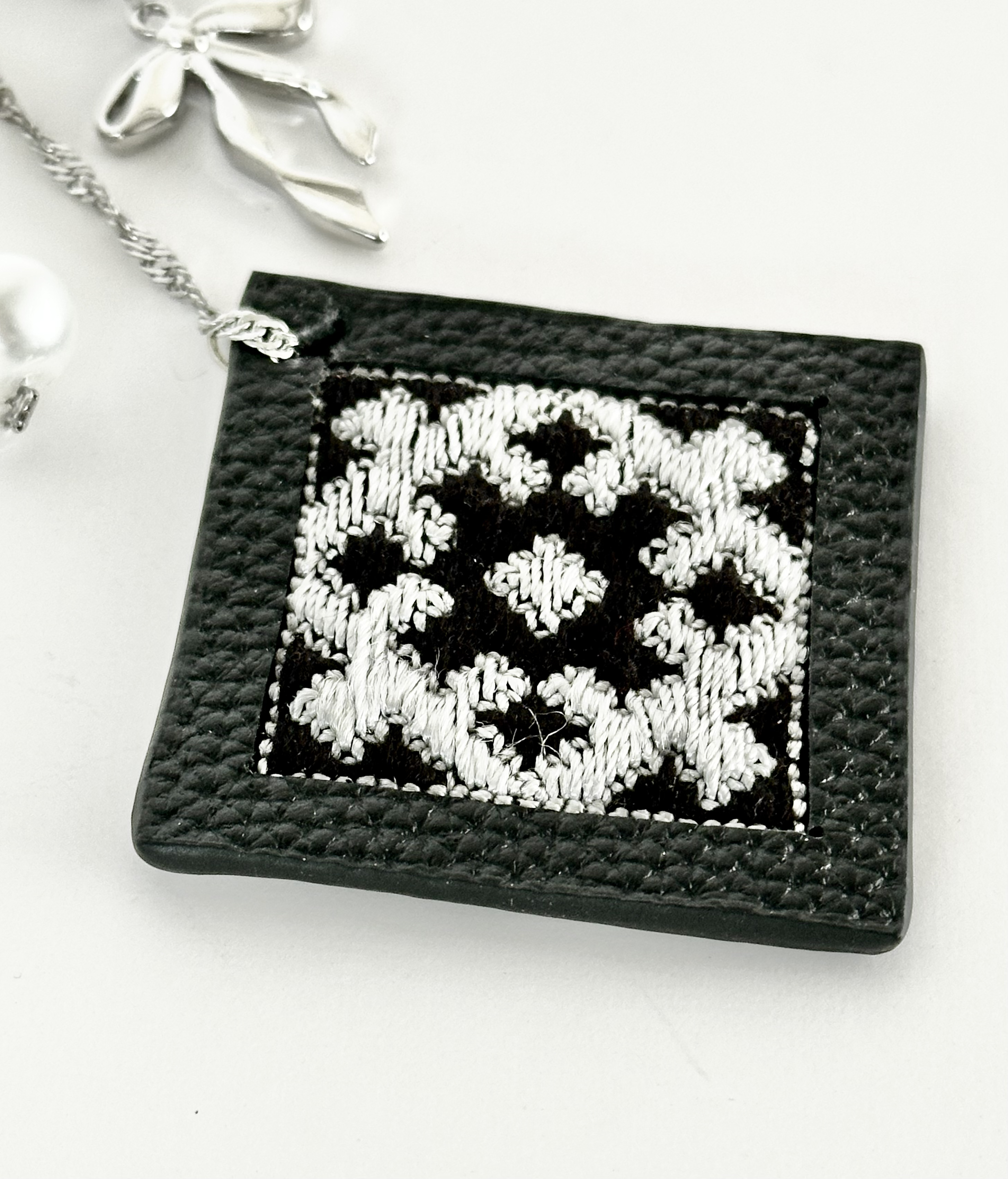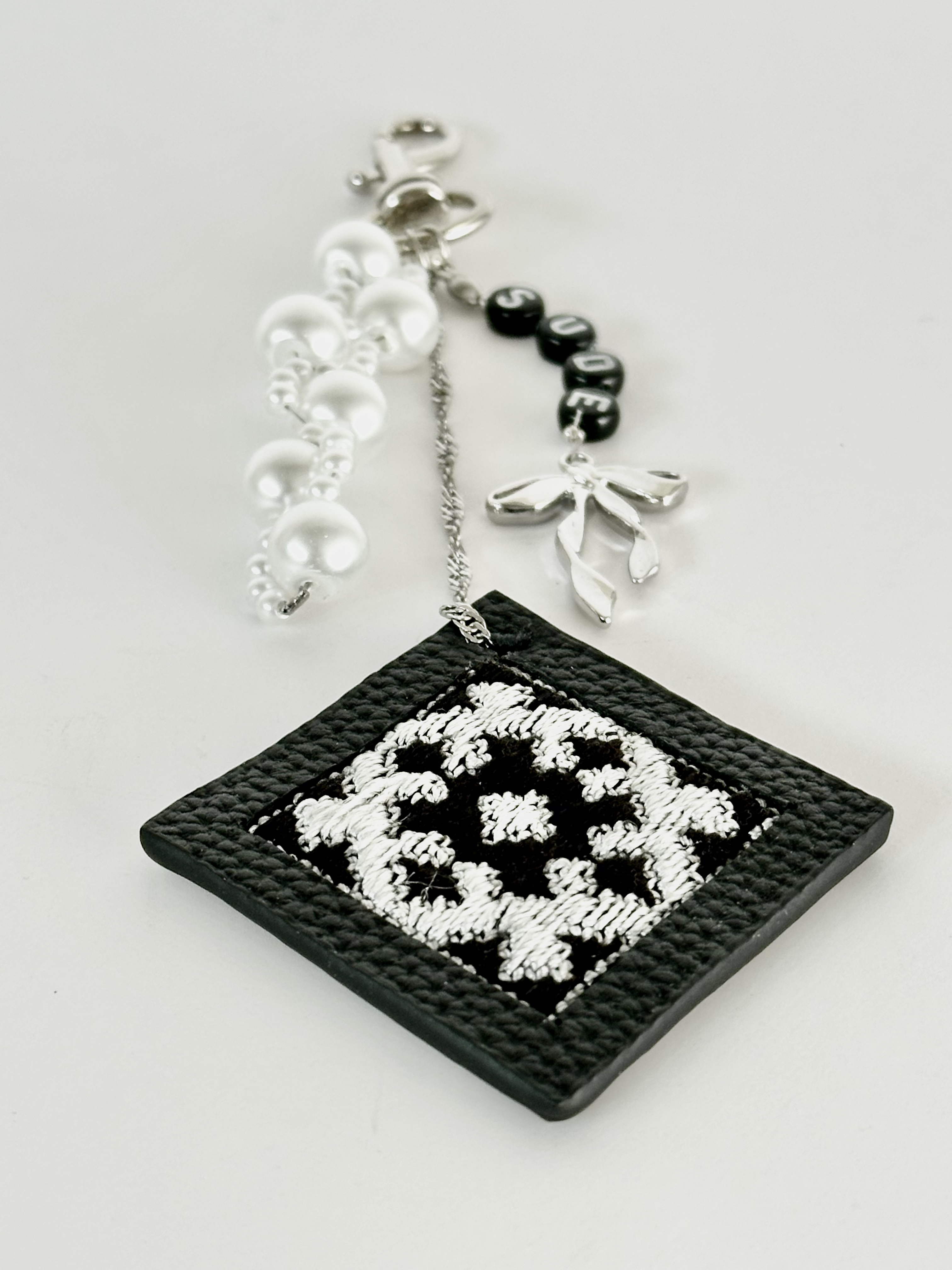 جاکلیدی چرم طبیعی سوزندوزی بلوچی، مروارید و آویز اسم شخصی سازی شده