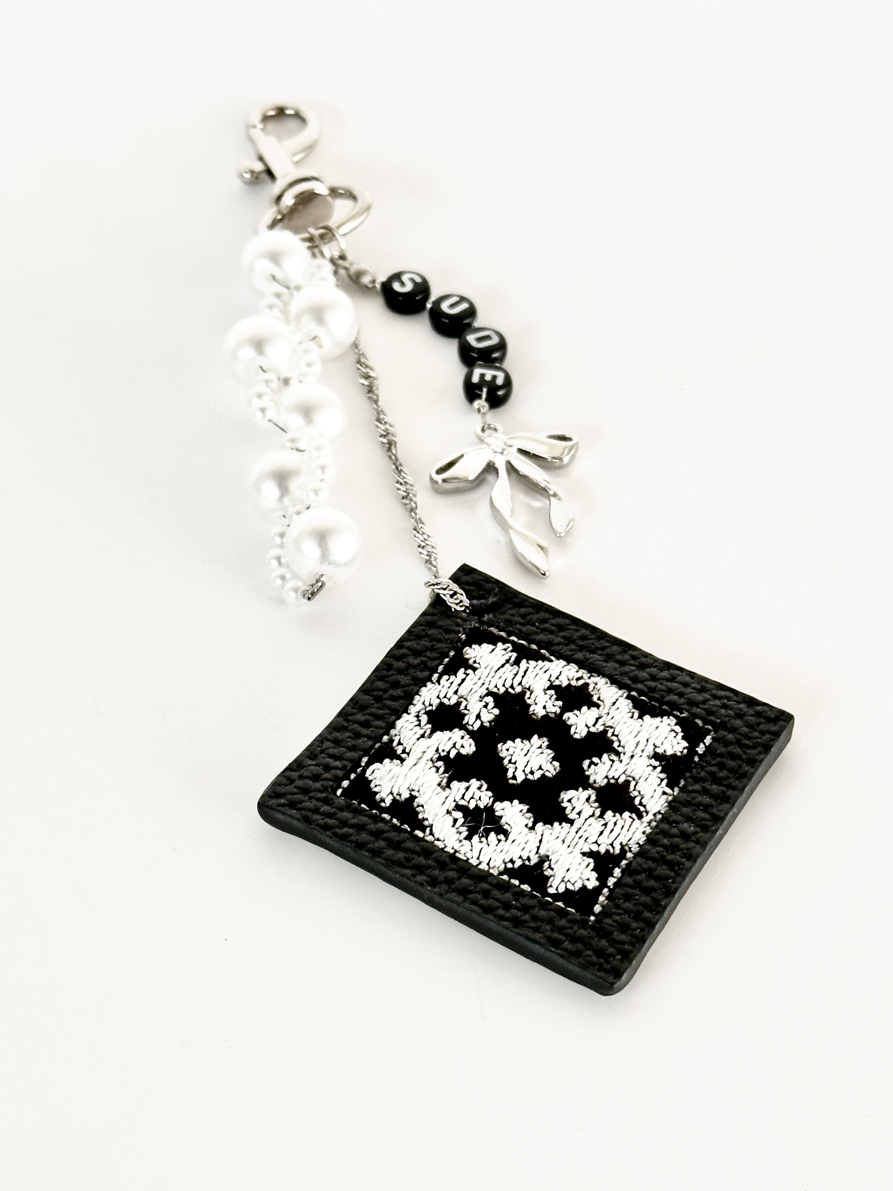 جاکلیدی چرم طبیعی سوزندوزی بلوچی، مروارید و آویز اسم شخصی سازی شده